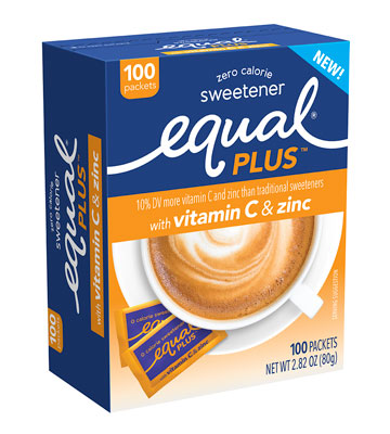 Equal PLUS with vitamin C & zinc has the Equal zero calorie sweetness you love with a good source of vitamin C & zinc in the convenience of an Equal packet. Equal PLUS with vitamin C & zinc delivers 10% daily value of vitamin C & zinc, which can help support a healthy immune system. Try it in your favorite coffee, tea, or however you enjoy the zero calorie sweetness of Equal.